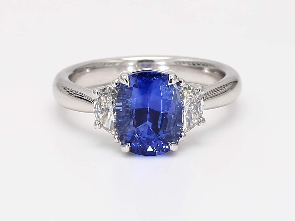 CUSHION CEYLON SAPPHIRE CDC 2501221 & HALF MOON DIAMOND PLATINUM RING