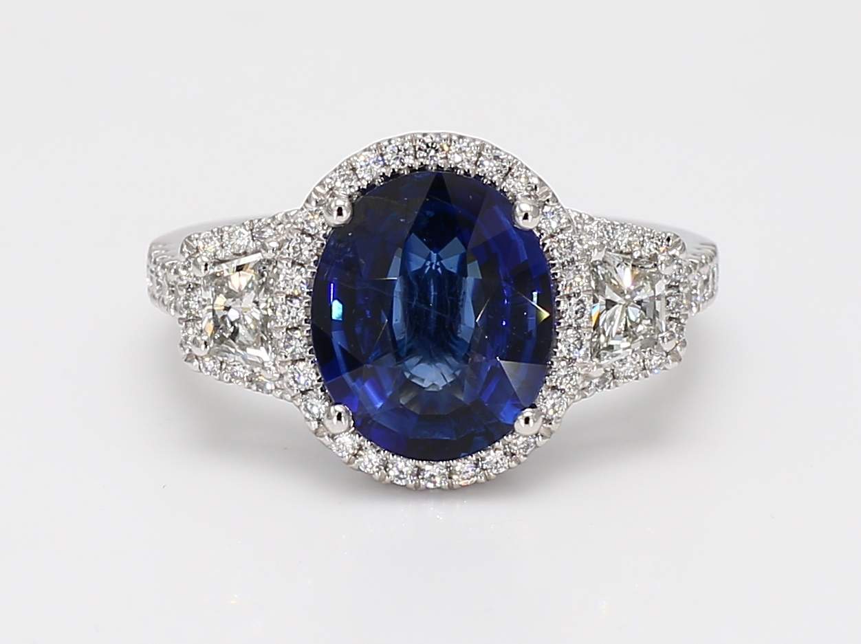 OVAL CEYLON SAPPHIRE VIVID BLUE CDC 2501236 & TRAPEZOID & ROUND DIAMOND PLATINUM RING