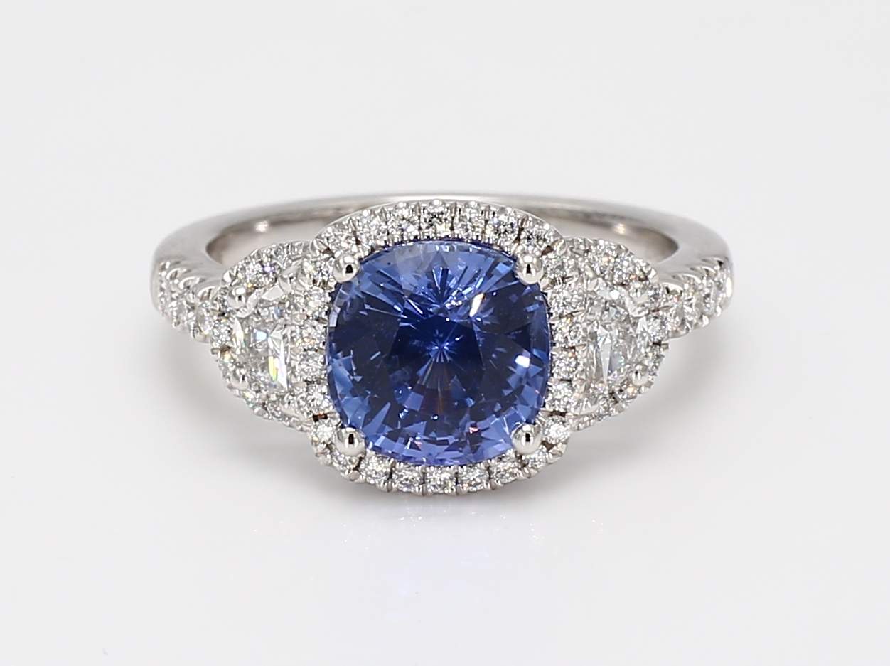 CUSHION SAPPHIRE CDC 2301899 & HALF MOON & ROUND DIAMOND PLATINUM RING