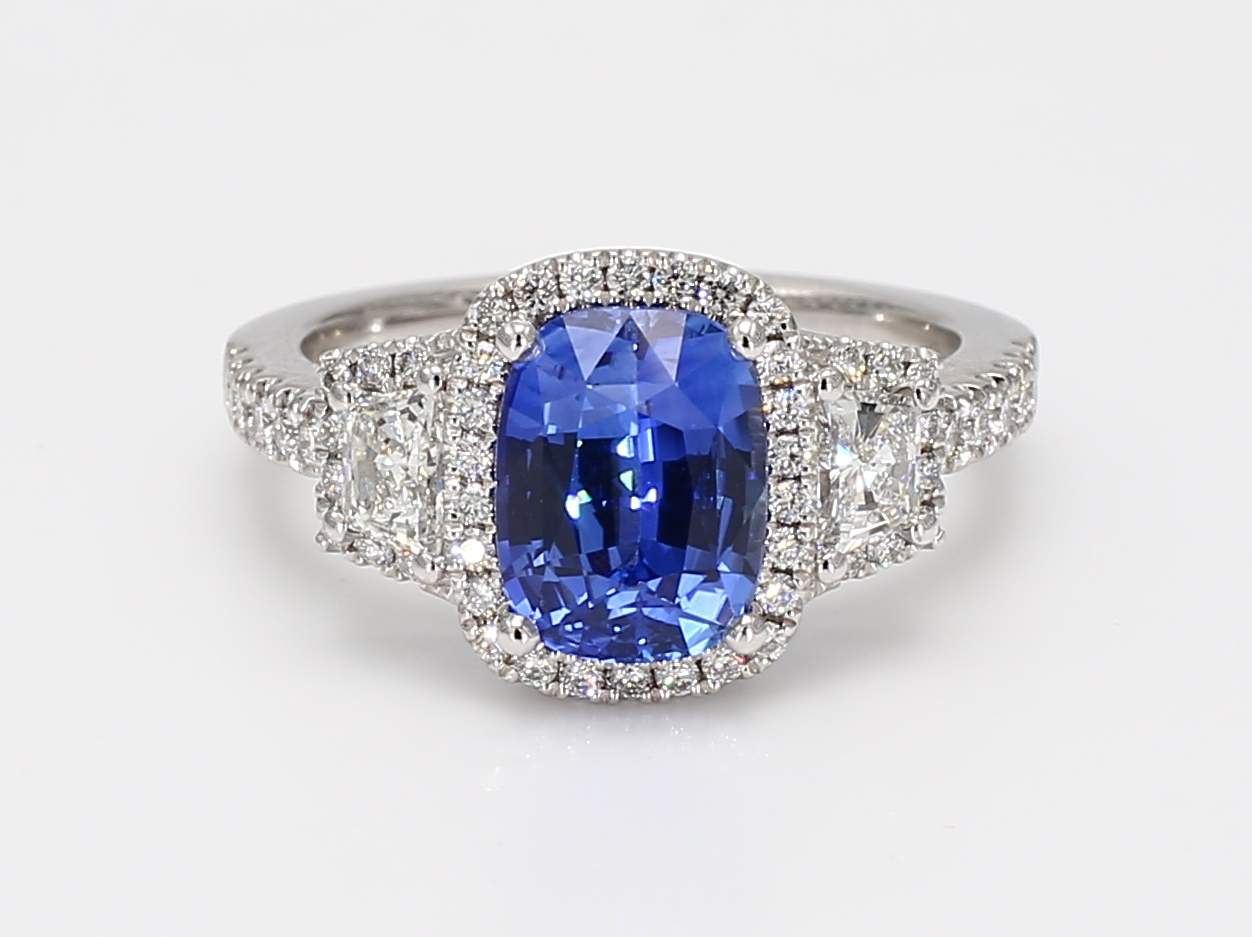 CUSHION SAPPHIRE CDC 2501219 & TRAPEZOID & ROUND DIAMOND PLATINUM RING