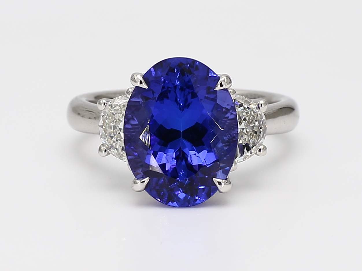 OVAL TANZANITE & HALF MOON DIAMOND PLATINUM RING