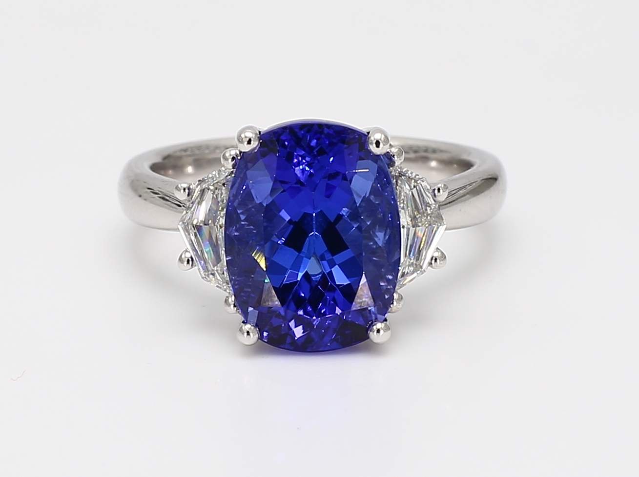 CUSHION TANZANITE & EPAULETTE DIAMOND PLATINUM RING
