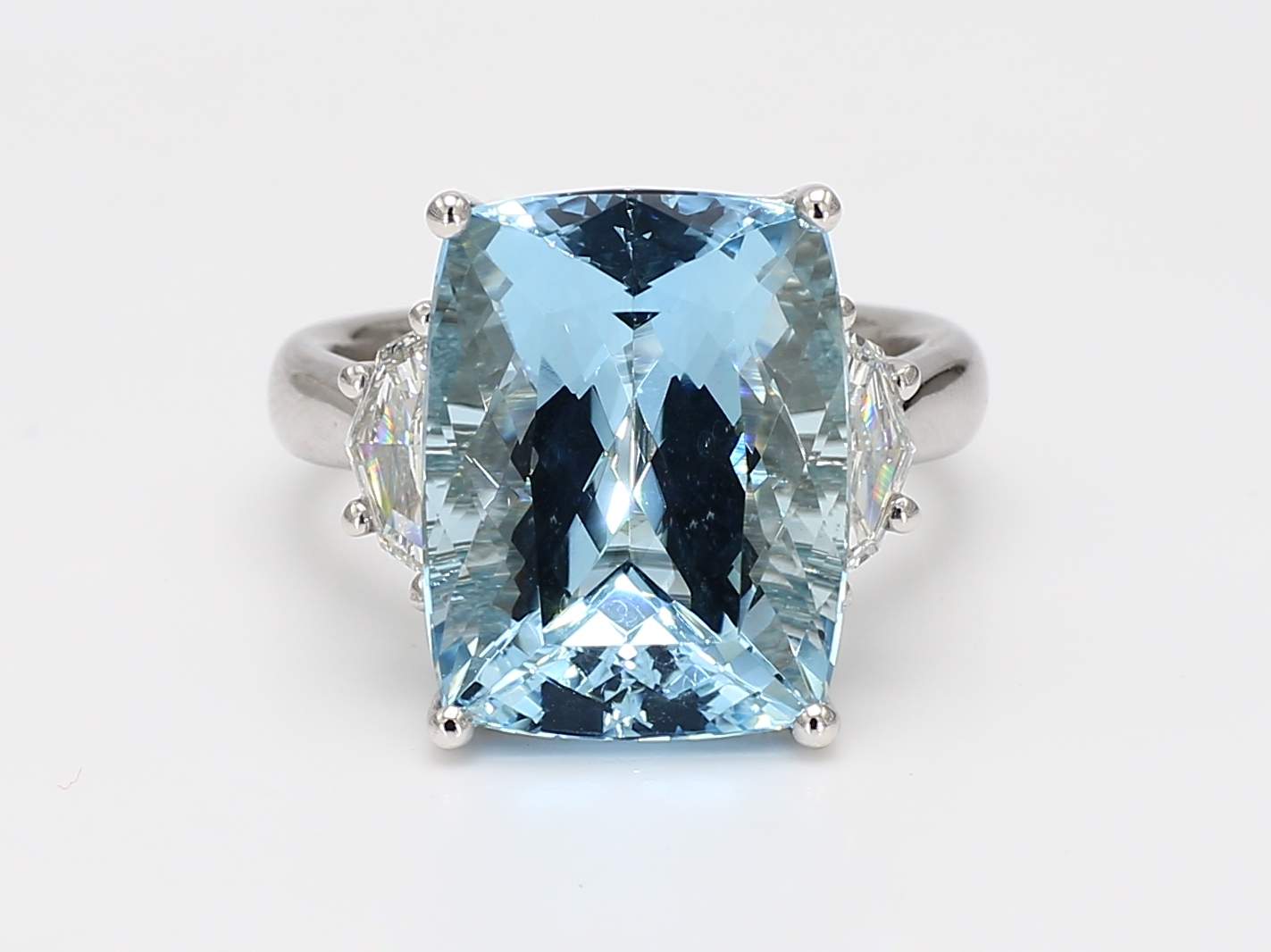 CUSHION AQUAMARINE & EPAULETTE DIAMOND PLATINUM RING