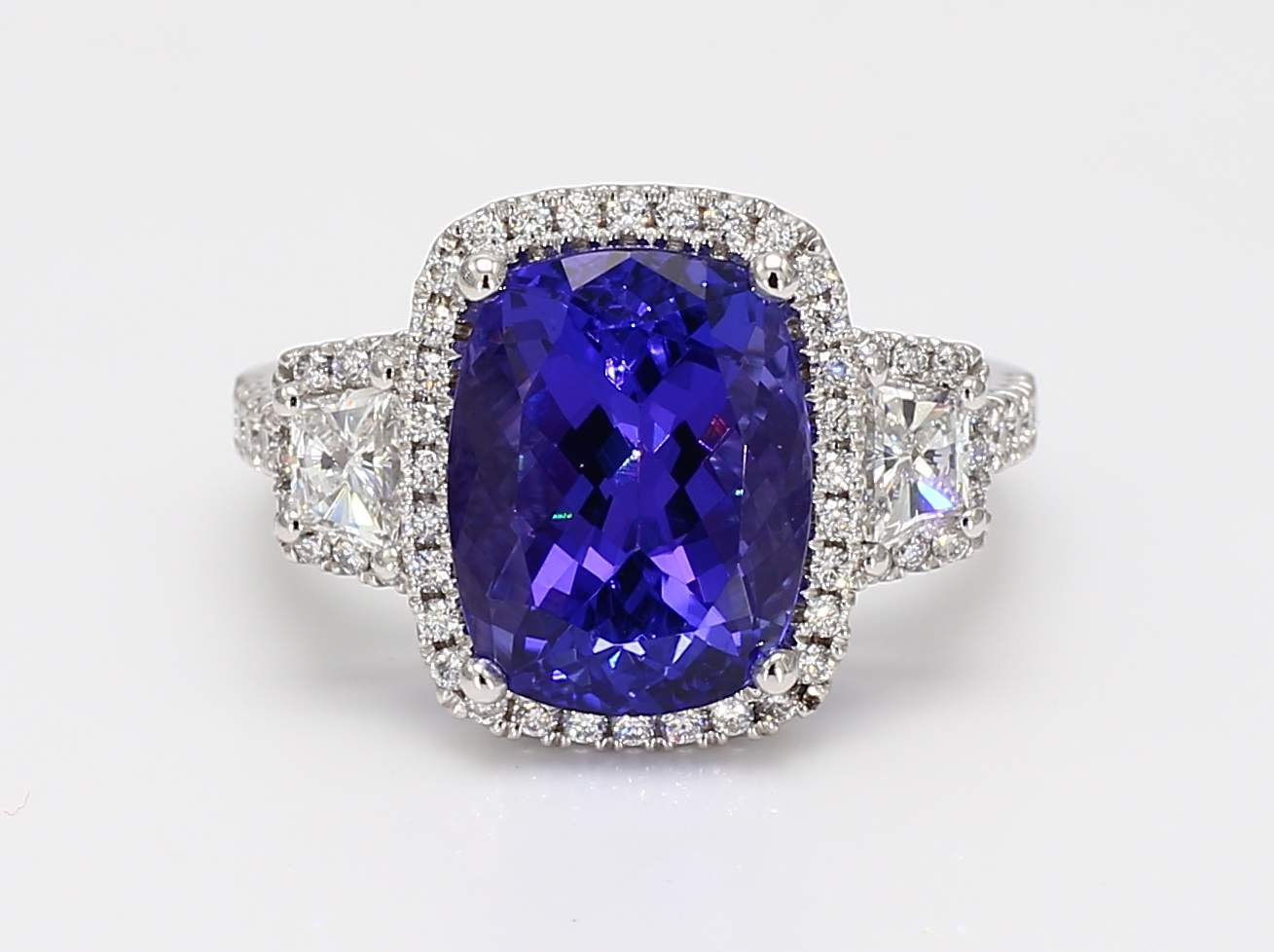 CUSHION TANZANITE & EPAULETTE DIAMOND & ROUND DIAMOND PLATINUM RING