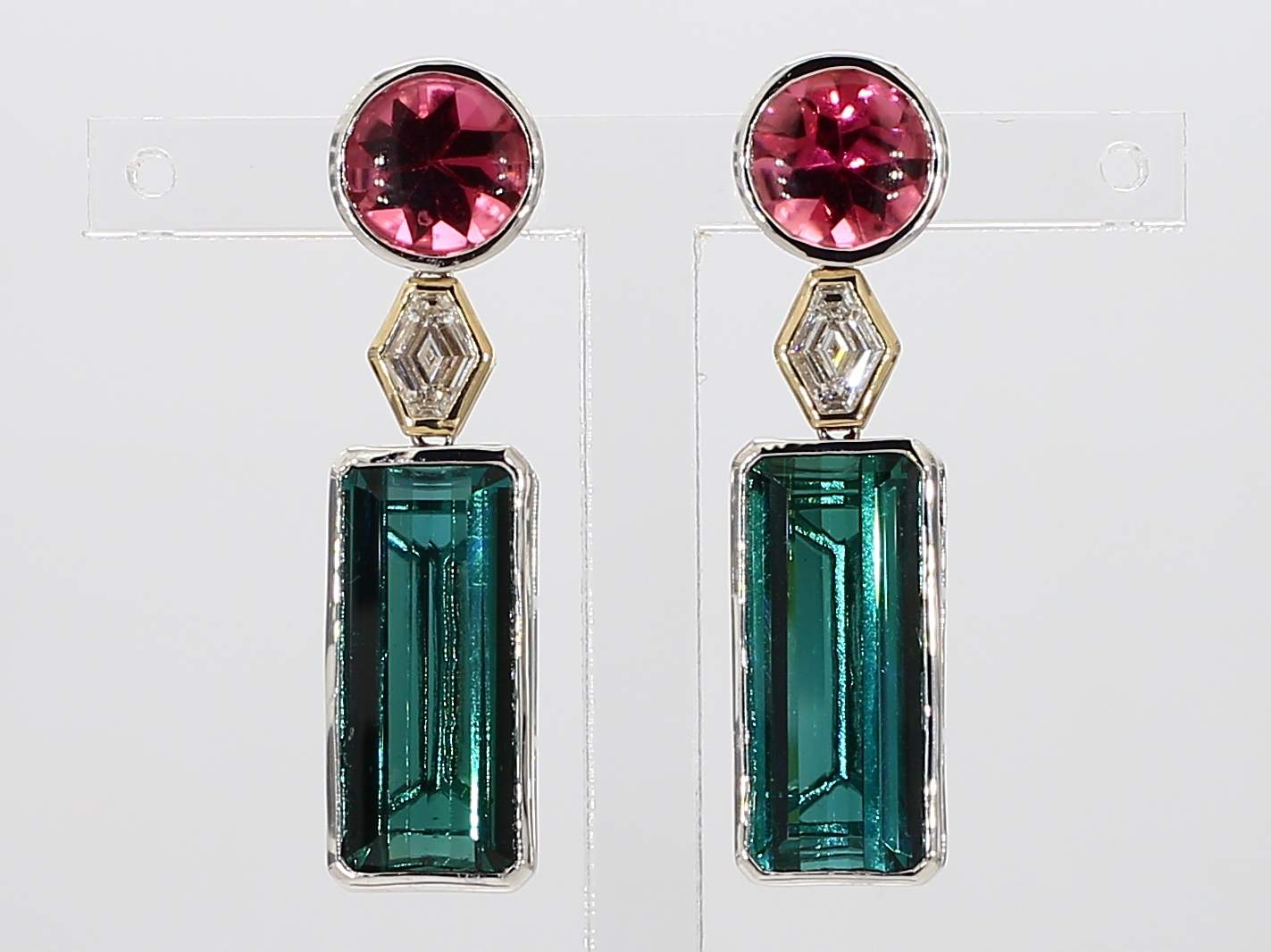 ROUND PINK TOURMALINE HEXAGON DIAMOND & EMERALD CUT BLUE TOURMALINE 14KT EARRING