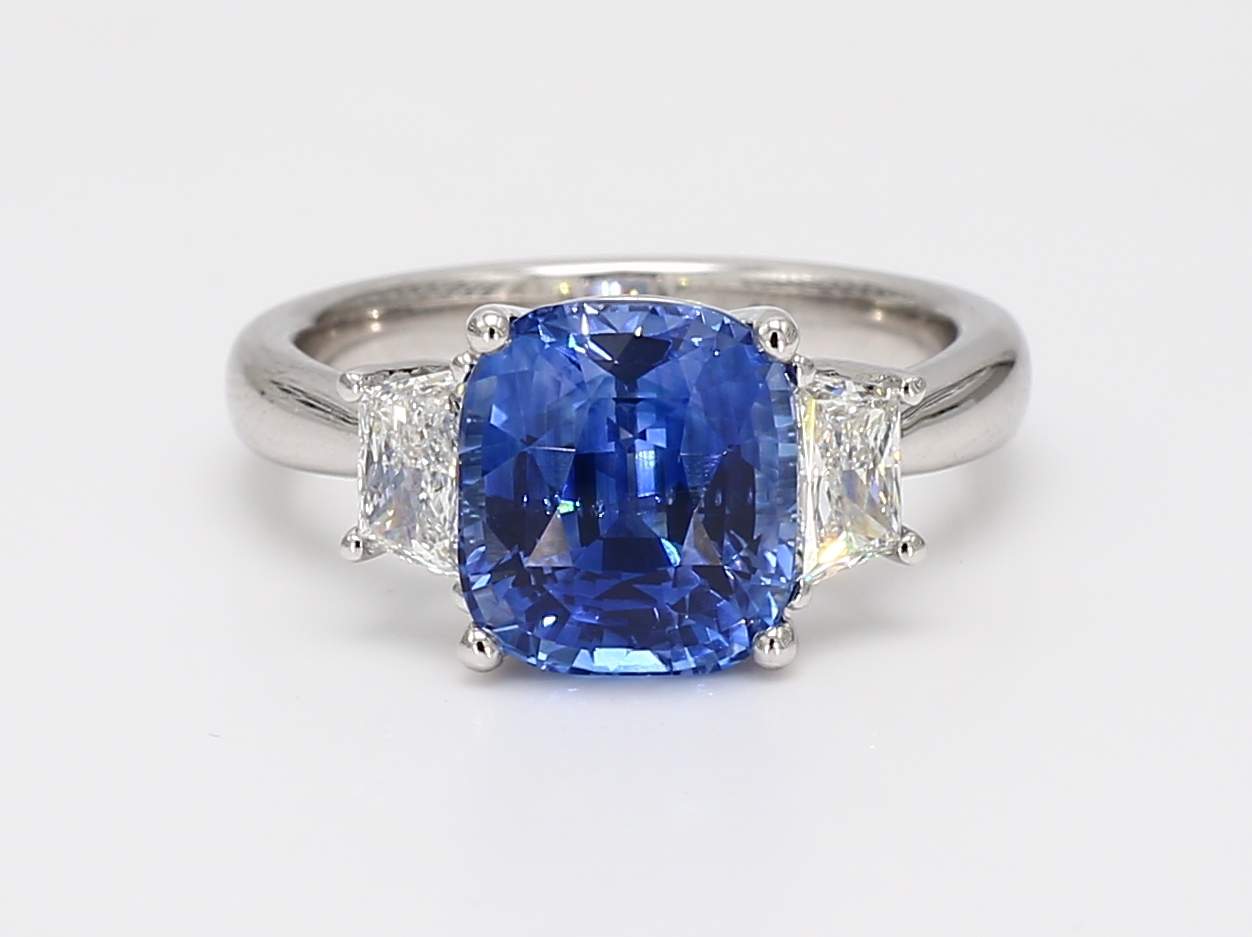CUSHION SAPPHIRE GIA 1232523830 & TRAPEZOID DIAMOND PLATINUM RING