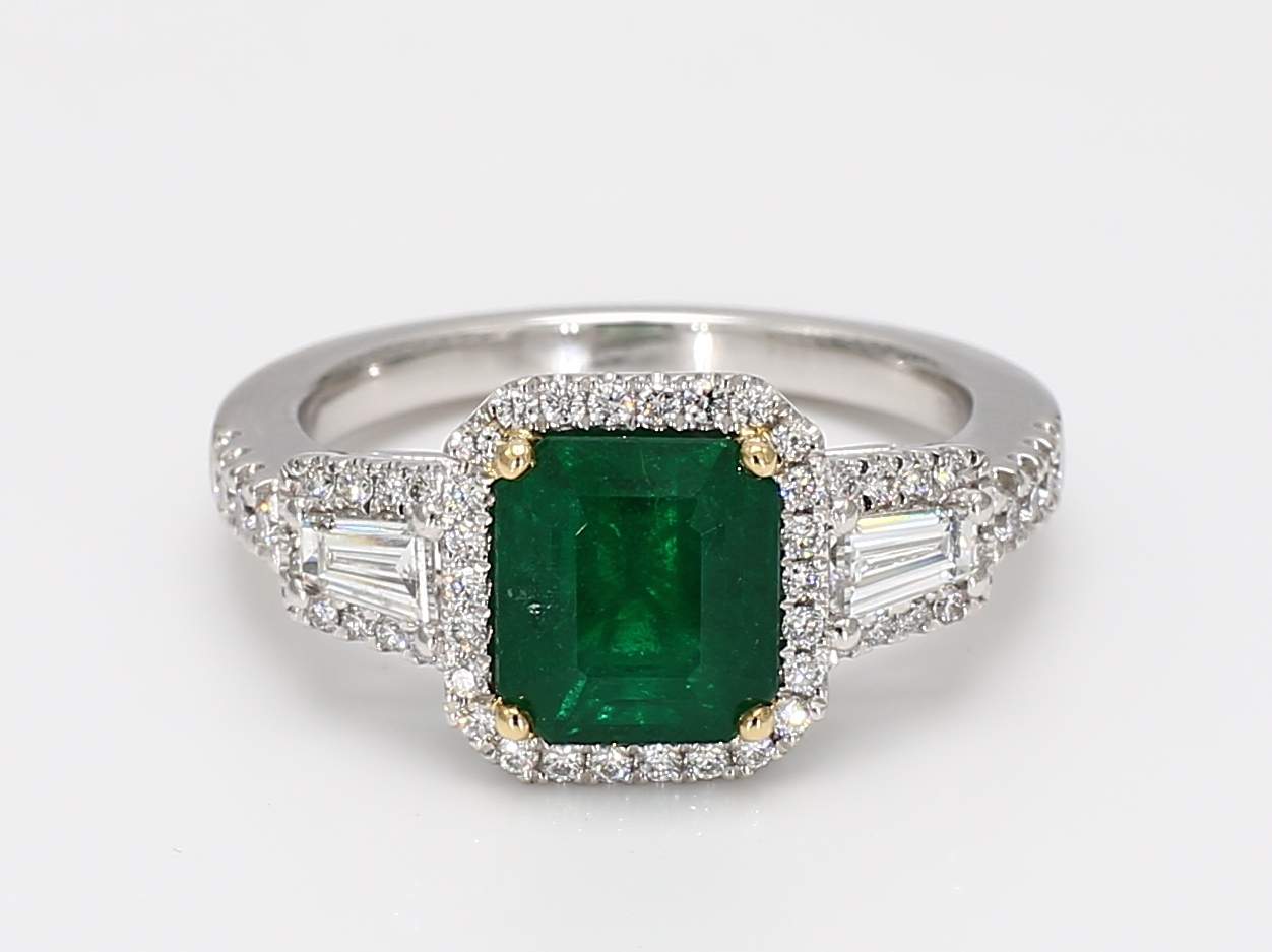 EMERALD CUT EMERALD & TAPER BAGUETTE & ROUND DIAMOND PLATINUM RING
