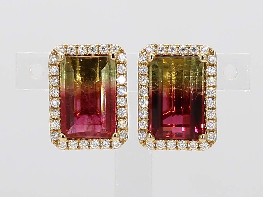 EMERALD CUT WATERMELON TOURMALINE & ROUND DIAMOND 14KY EARRING
