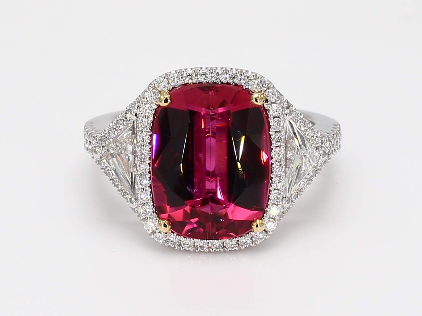 CUSHION PINK TOURMALINE & TRIANGLE & ROUND DIAMOND PLATINUM RING