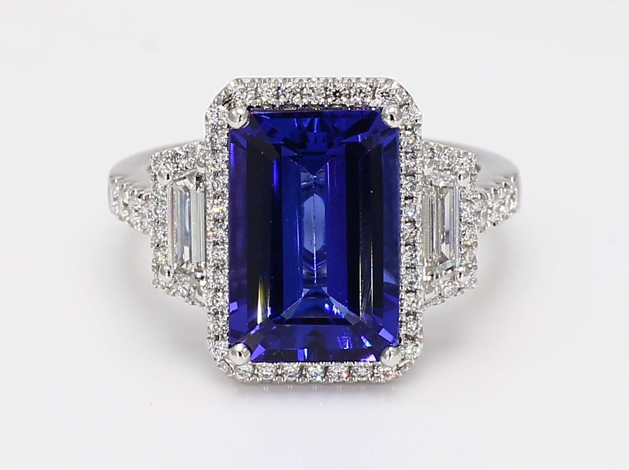 EMERALD CUT TANZANITE & TRAPEZOID & ROUND DIAMOND PLATINUM RING