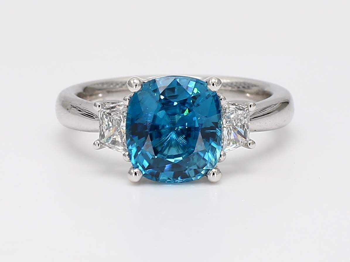 CUSHION ZIRCON & TRAPEZOID DIAMOND PLATINUM RING