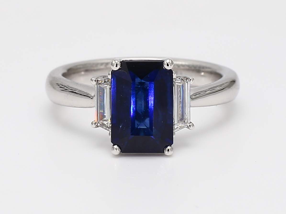 EMERALD CUT SAPPHIRE & TRAPEZOID DIAMOND PLATINUM RING