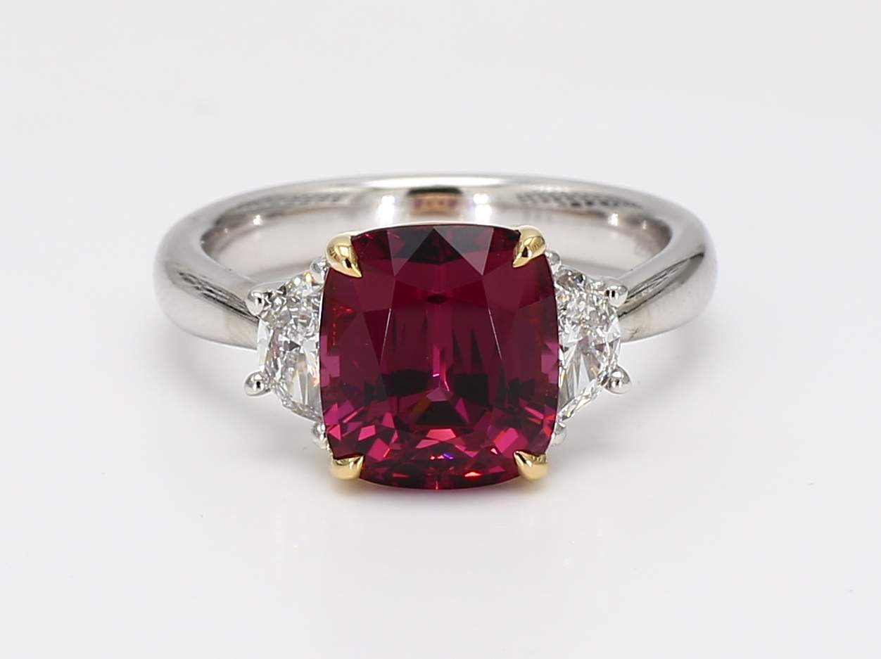 CUSHION UMBALITE GARNET & HALF MOON DIAMOND PLATINUM & 18KY RING
