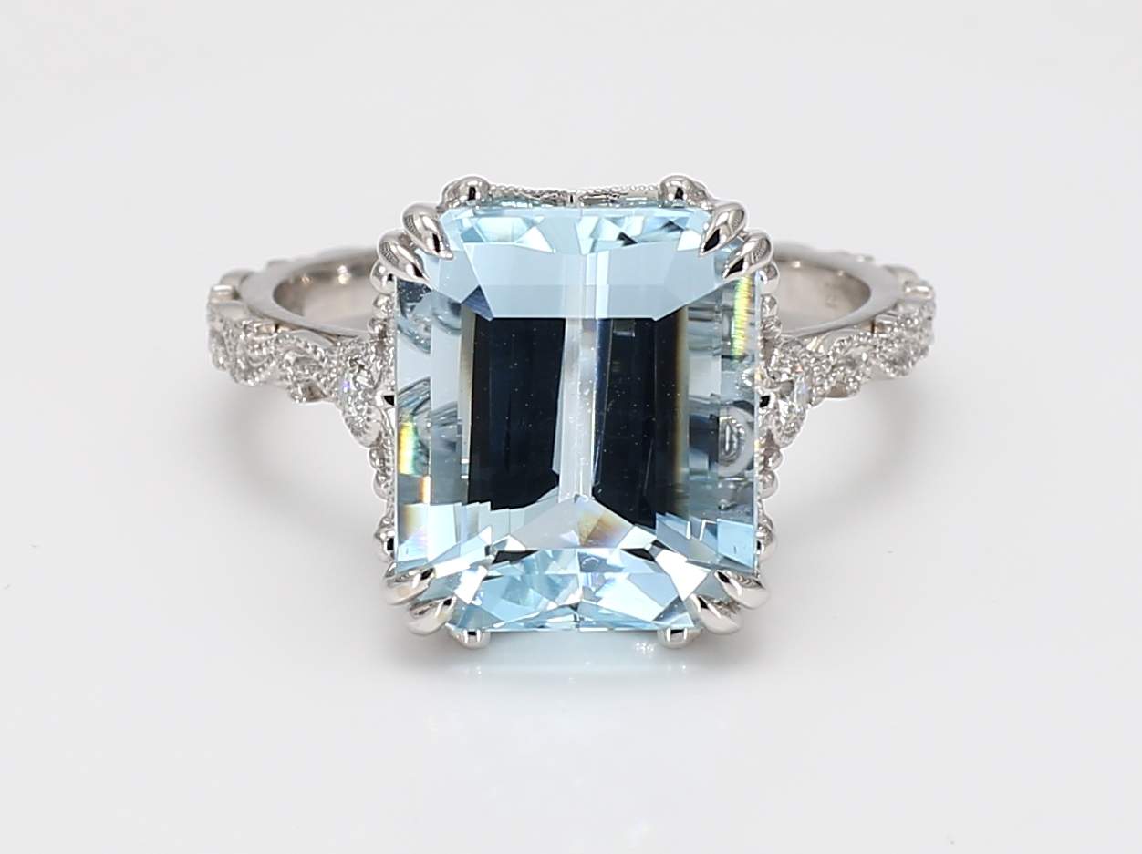 EMERALD CUT AQUAMARINE & ROUND DIAMOND 14KW RING
