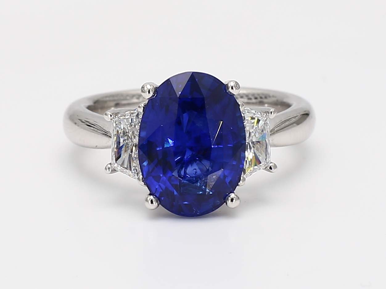 OVAL CEYLON SAPPHIRE ROYAL BLUE CDC 2505454 & TRAPEZOID DIAMOND PLATINUM RING