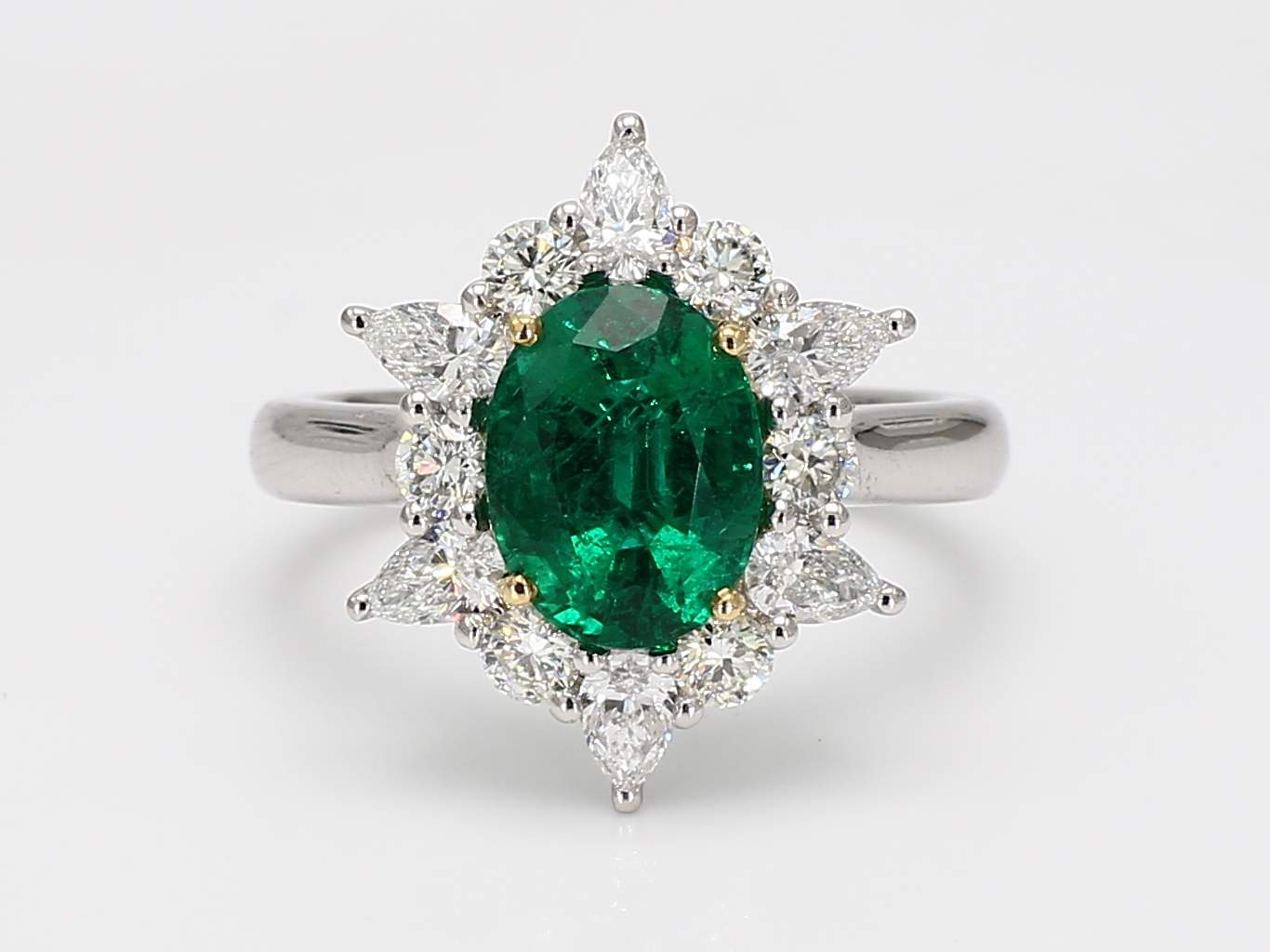 OVAL EMERALD VIVID GREEN MINOR CDC 2505469 & PEAR SHAPE & ROUND DIAMOND PLATINUM & 18KY RING