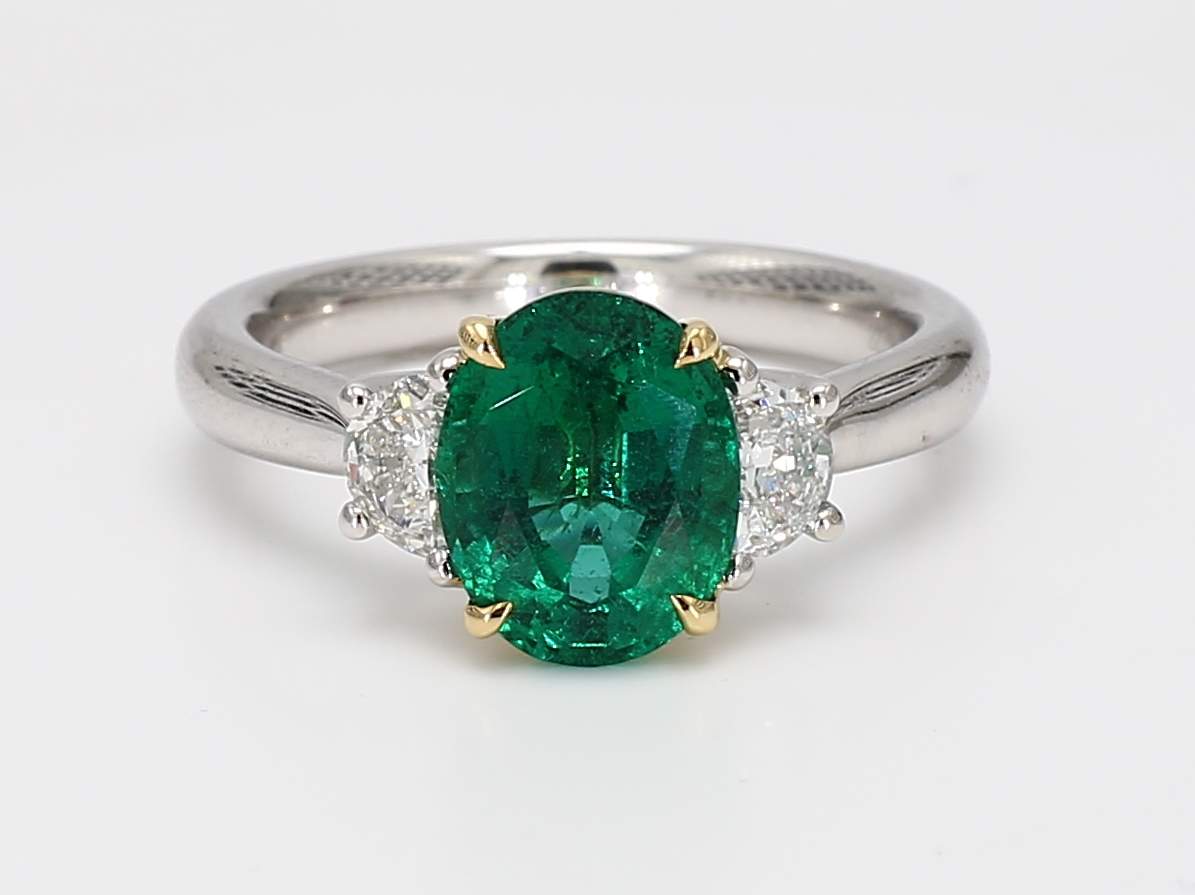 OVAL EMERALD VIVID GREEN MINOR CDC 2505470 & HALF MOON DIAMOND PLATINUM & 18KY RING