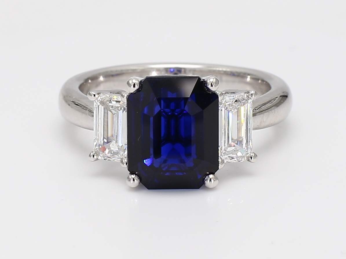 UNHEATED EMERALD CUT SAPPHIRE CDC 2411244 & EMERALD CUT DIAMOND PLATINUM RING