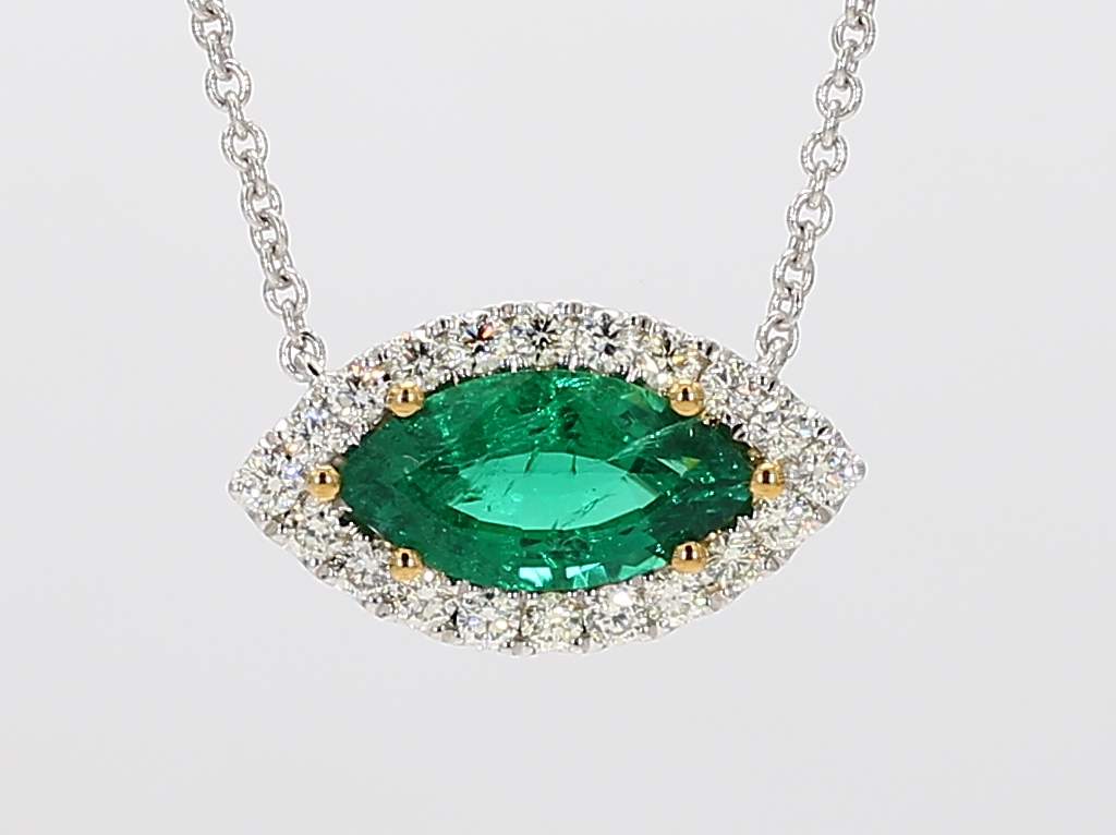 MARQUISE EMERALD VIVID GREEN MINOR CDC 2505467 & ROUND DIAMOND 14KW NECKLACE