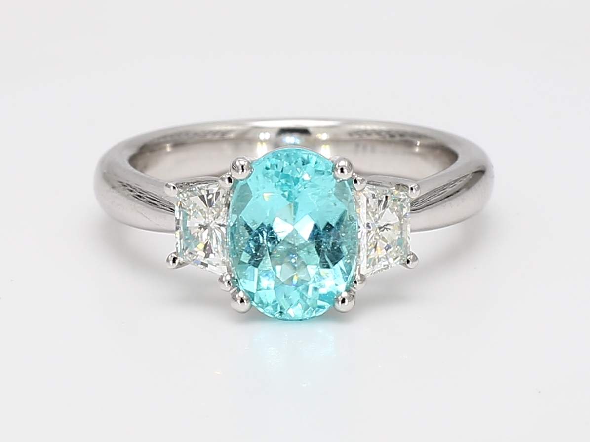 OVAL PARAIBA TOURMALINE GIA 2231594893 & TRAPEZOID DIAMOND PLATINUM RING
