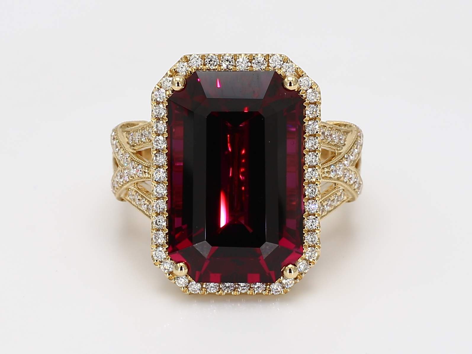 EMERALD CUT RHODOLITE GARNET & ROUND DIAMOND 14KY RING