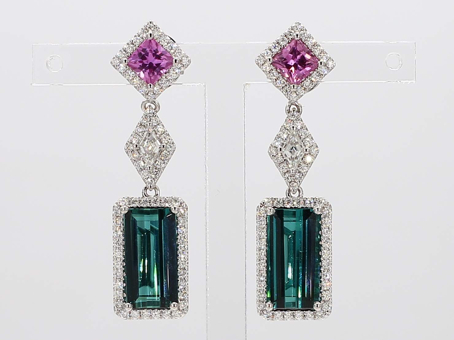PRINCESS CUT PINK SAPPHIRE KITE SHAPE DIAMOND EMERALD CUT BLUE TOURMALINE & ROUND DIAMOND 14KW EARRING