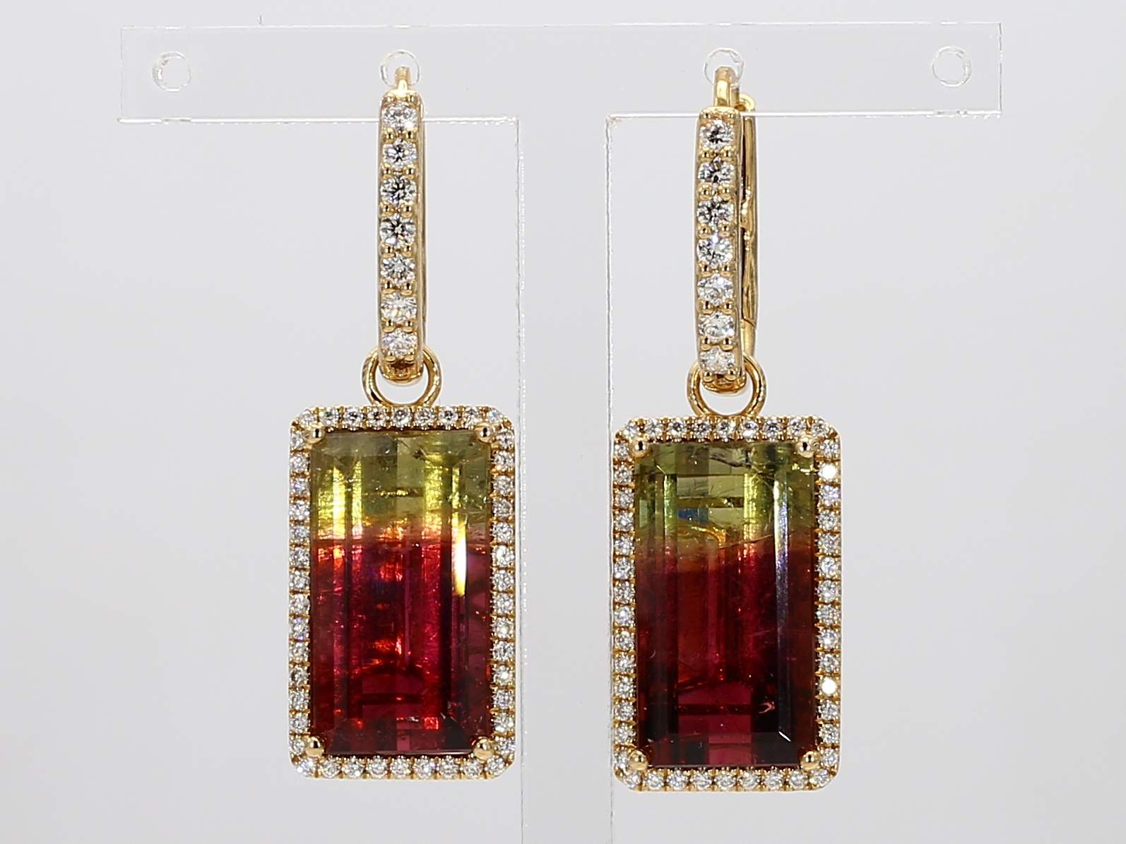 EMERALD CUT WATERMELON TOURMALINE & ROUND DIAMOND 14KY EARRING