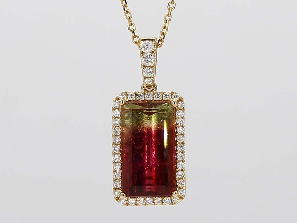 EMERALD CUT WATERMELON TOURMALINE & ROUND DIAMOND 14KY PENDANT