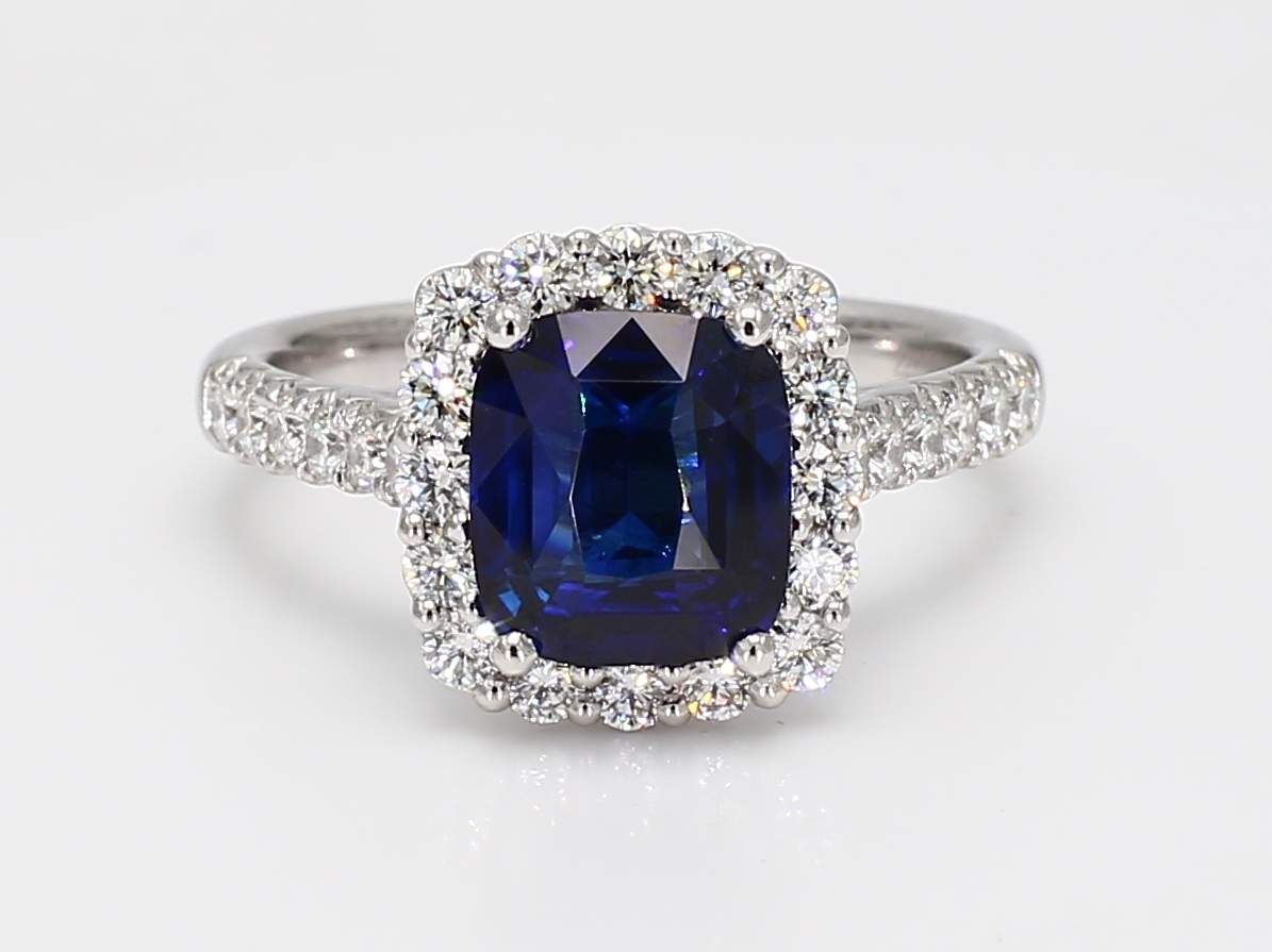 CUSHION CEYLON SAPPHIRE CDC 25051121 & ROUND DIAMOND PLATINUM RING