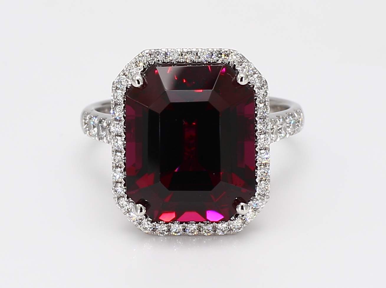 EMERALD CUT RHODOLITE GARNET & ROUND DIAMOND 14KW RING