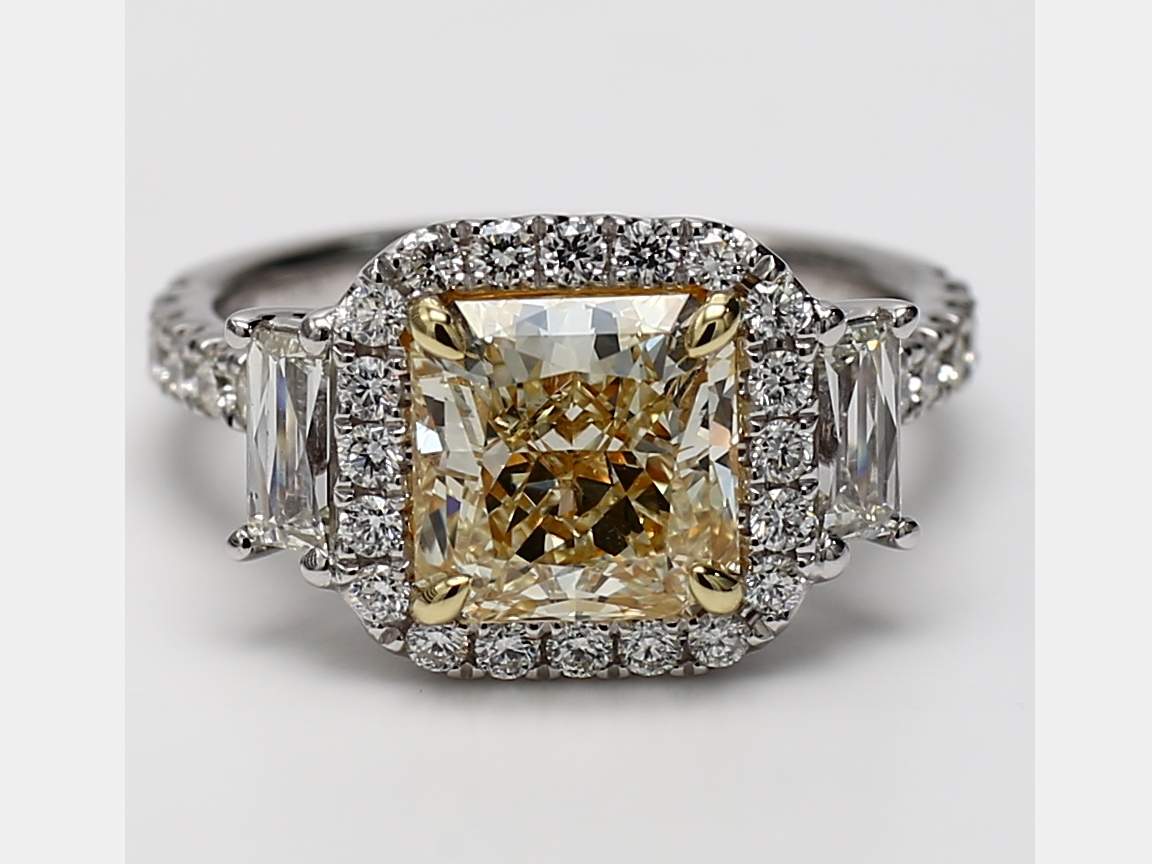RADIANT YELLOW DIAMOND Y-Z GIA & FRENCH CUT BAGUETTE & ROUND DIAMOND PLATINUM RING