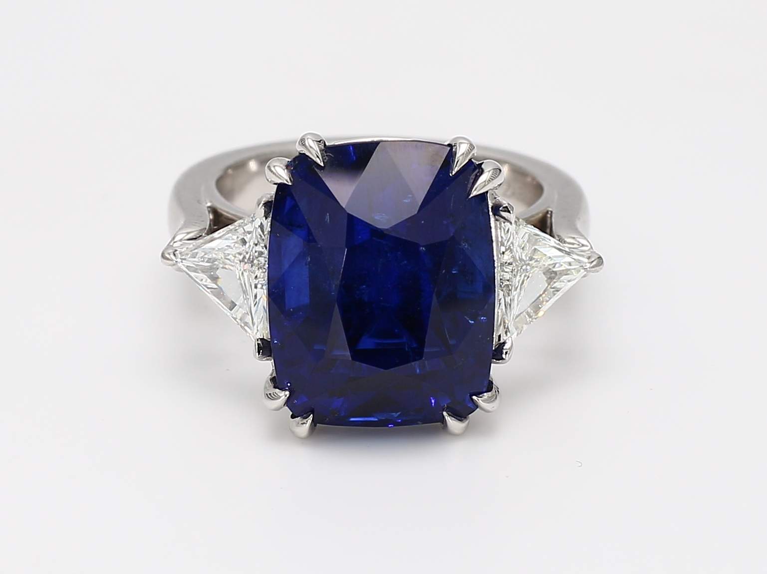 CUSHION CEYLON SAPPHIRE ROYAL BLUE CDC 2408518 & TRIANGLE DIAMOND PLATINUM RING