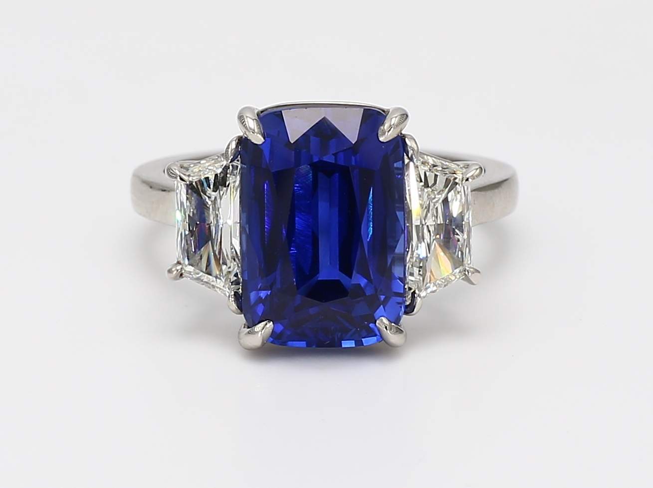 CUSHION ROYAL BLUE SAPPHIRE CDC 2506215 & TRAPEZOID DIAMOND PLATINUM RING