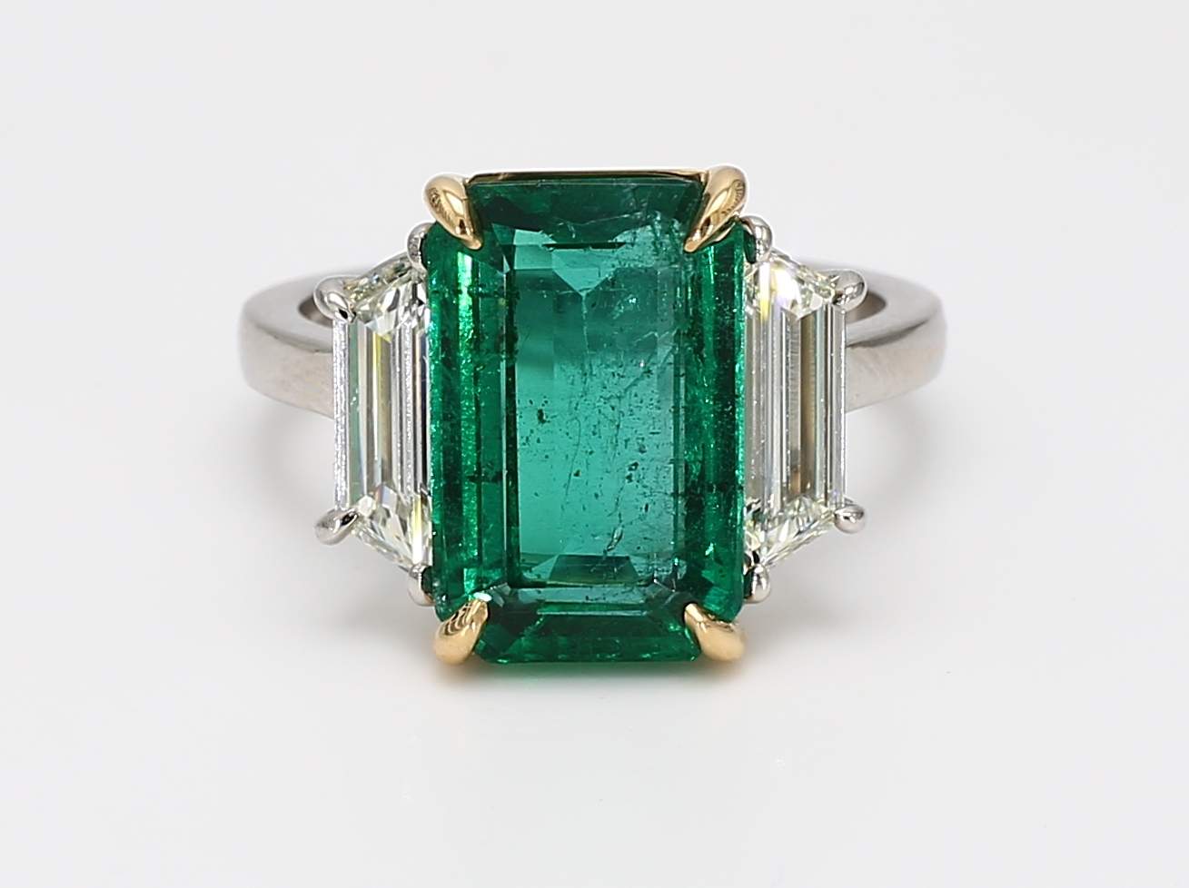 EMERALD CUT EMERALD VIVID GREEN MINOR CDC 2505460 & TRAPEZOID DIAMOND PLATINUM RING