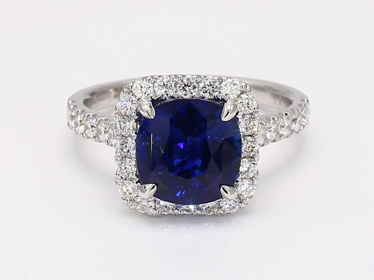 CUSHION CEYLON SAPPHIRE ROYAL BLUE CDC 2508578 & ROUND DIAMOND 18KW RING