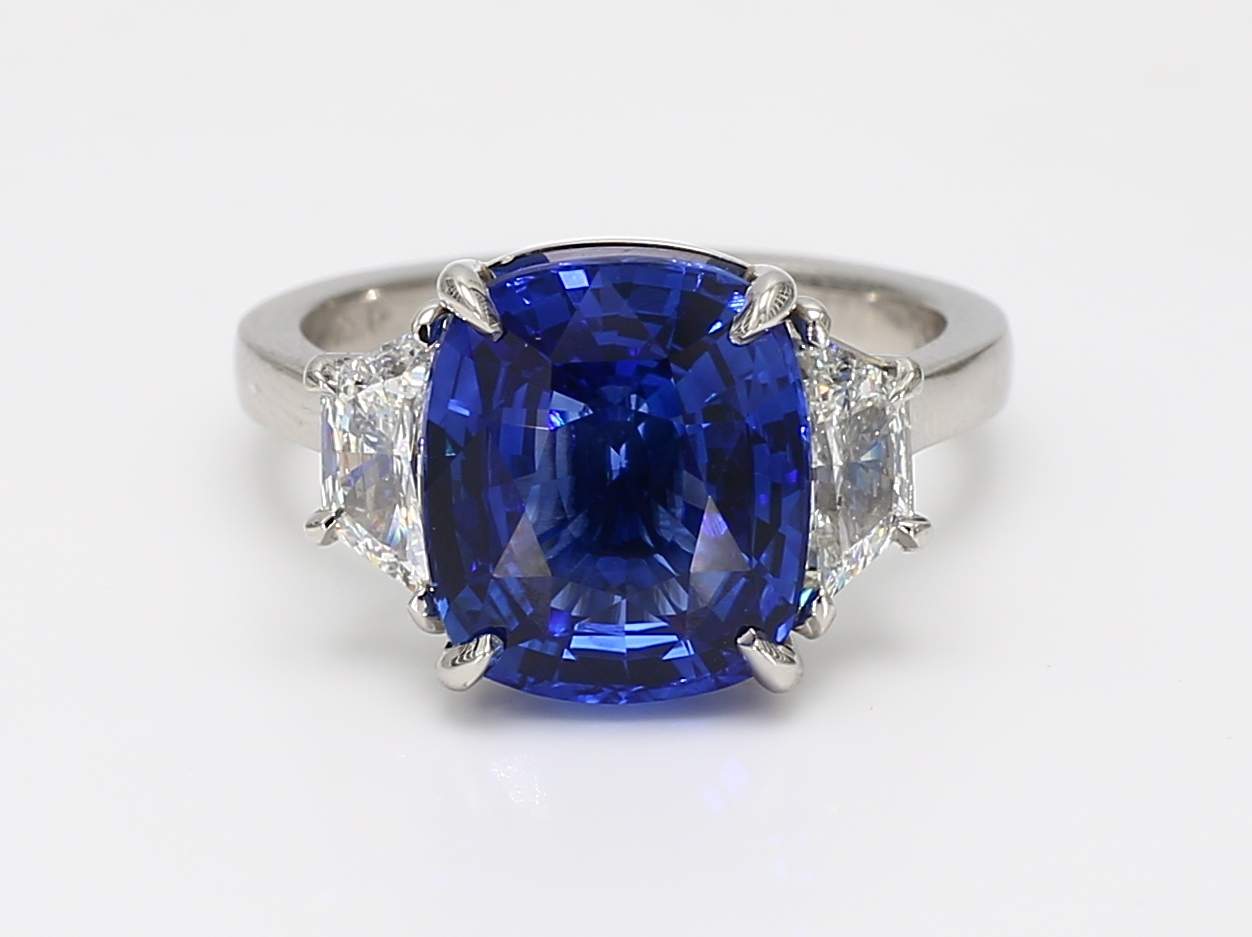 CUSHION SAPPHIRE CDC 2508580 & TRAPEZOID DIAMOND PLATINUM RING